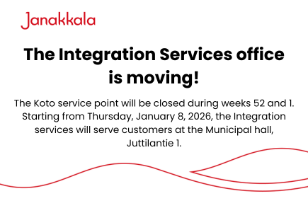 The Koto service point will be closed during weeks 52 and 1. Starting from Thursday, January 8, 2026, the Integration services will serve customers at the Municipal hall, Juttilantie 1.