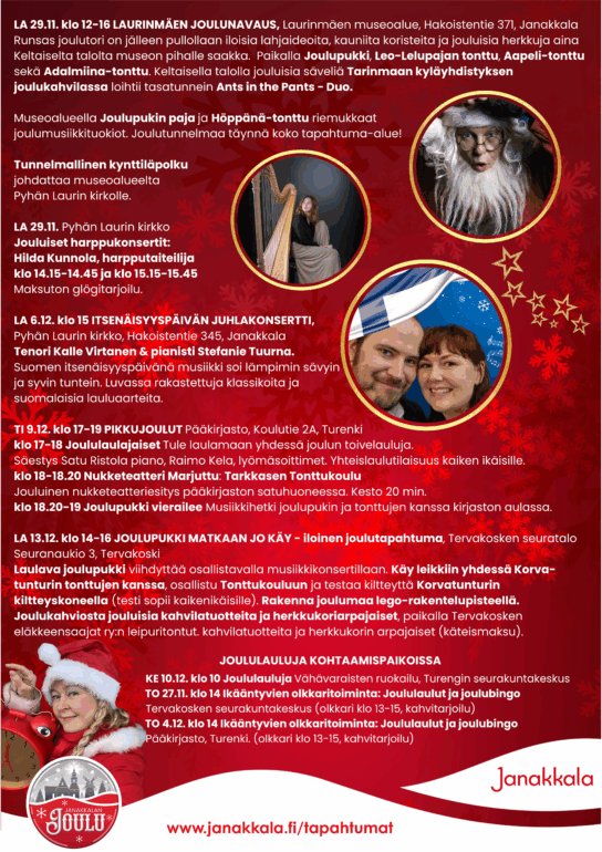 | 20.11 klo 13-13.30 Keskustelua ikääntyvien kulttuuripalveluista, tulevien tapahtumien esittelyä ja yhteislaulua, ohjaus Satu Ristola 13:30 kahvittelua ja Janakkalan yhteinen kirjasto -hankkeen koordinaattori Riikka Hyvärinen ”esittäytyminen ja mitä hankkeessa tapahtuu” | |