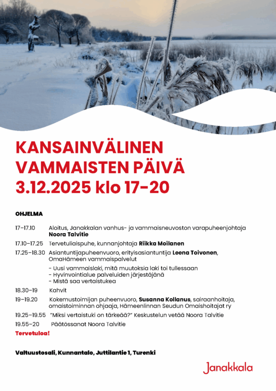 Yhteydenotot: Vanhus- ja vammaisneuvoston puheenjohtaja Helena Puistola, helena.puistola@janakkala.fi.