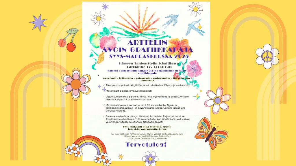 Hämeen Taidearttelin kaikille avoin omatoiminen nonstop-grafiikkapaja on avoinna tiistaisin klo 14–20 syyskuun 2. päivästä alkaen marraskuun loppuun Hämeen Taidearttelin toimitilassa Parolantie 17, 13130 HML.