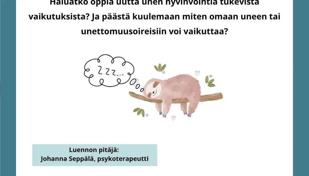 Nuori aikuinen! Nyt on mahdollisuus päästä ilmaiseksi kuulemaan millaisia keinoja on tarjolla unettomuuden hoitoon lääkkeettömästi. Pääset kuulemaan ja oppimaan uutta unen hyvinvointivaikutuksista ja keinoista, joilla voi vaikuttaa omaan uneen ja unettomuuteen Käypä hoito-suositusten mukaan. Luennon pitäjänä Johanna Seppälä, psykoterapeutti.
