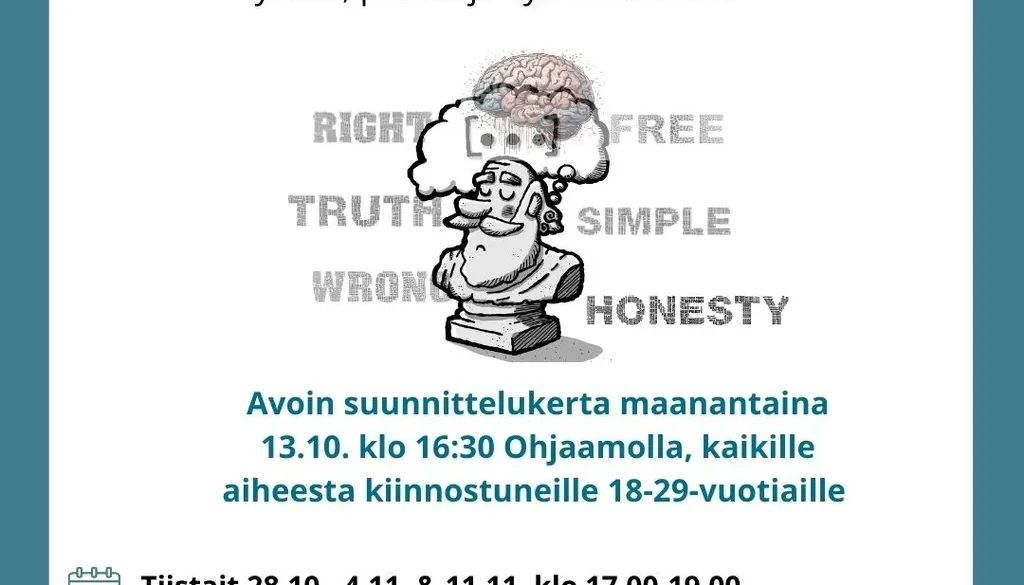 Filosofiseen ajatteluun keskittyvän porukan ideointikerta – lähde mukaan porukkaan, jossa pääset ideoimaan toimintaa ja pohtimaan filosofisia teemoja ja aiheita.