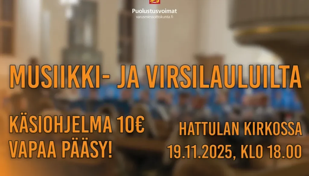 Puolustusvoimien varusmiessoittokunnan aliupseerikurssi esittää Hattulan kirkossa hartaita sekä rakastettuja virsiä, 19.11.2025 kello 18.00. Saavu paikanpäälle kokemaan syksyinen ja yhteisöllinen tilaisuus soittokunnan säestyksellä ja tulkintoineen!