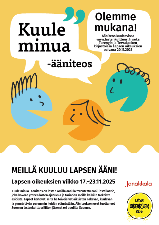 Lapsen oikeuksien viikolla 17.–23.11.2025 eri puolilla Suomea kuullaan lapsia uudessa Kuule minua -ääniteoksessa. Teos muistuttaa jokaisen lapsen oikeudesta tulla kuulluksi. Lasten ääni täyttää julkisia tiloja, kun Kuule minua -ääniteos soi Lapsen oikeuksien viikolla. Teos on toteutettu yhteistyössä Suomen lastenkulttuuriliiton jäsenten kanssa, ja se kokoaa yhteen lasten omia näkökulmia valtakunnallisen viikon teemaan: “Lapsen oikeus kuulua.”